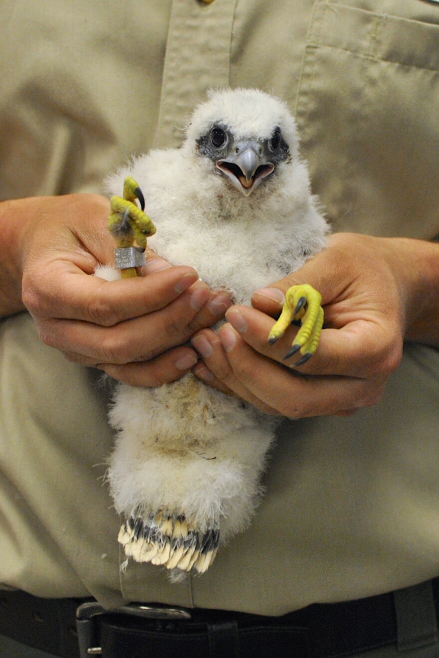 The peregrine falcon chicks that hatched in a nesting box at Louisville Gas and Electric’s Mill Creek power plant are one step closer to leaving home.The chicks hatched about 23 days ago. Their home is currently a nesting box high on one of the plant's cooling towers, and since hatching, the chicks have been left alone. But now, it’s time for biologists from the Kentucky Department of Fish and Wildlife to fasten metal bands to the chicks’ legs for identification purposes.There are two other peregrine falcon nests that biologists know of in Louisville—one by the Big Four Bridge, and one at the Cane Run power plant. Falcons historically nest on cliffs...but these days, any tall structure will do. At Mill Creek, the whole egg incubation and hatching process has been broadcast via webcam.There were five chicks that hatched earlier this month, but only four have survived. No one is sure why the fifth chick died, but it’s rare that there are even that many eggs in a nest. A normal clutch is three or four.In a conference room at the power plant, avian biologist Kate Heyden reaches into a copier paper box that’s labeled ‘falcon chicks—fragile’ and lifts out the first bird. He’s a fluff of white feathers but with big eyes and a deadly-looking beak and talons. He’s also very vocal, and begins screeching.The scientists put a bandana over the chick's head so he calms down. Heyden rivets the first band around the chick’s leg. She also swabs their throats, so they can test for a disease called trichomoniasis. It’s often caused by pigeons, and can be fatal for chicks.Heyden points to a group of feathers around the chick’s tail.“So we can see his flight feathers are just starting to grow out here, they’re maybe an inch long,” she said. “These are the same feathers he’s going to keep for a whole year after he learns to fly.”The flying won’t happen for another 20 days or so. Heyden says the birds will begin by flapping their wings for several days, to build up their flight muscles.“Finally one day, they’ll have enough strength to where they’ll flap their wings and usually end up gliding to a nearby high object,” she said.Even once they start flying, the birds will stay with their parents until they learn how to hunt. Now that they're banded, biologists can monitor their survival, and see whether they mate and have chicks in the wild.To watch the chicks go about their business on the webcam, click here.