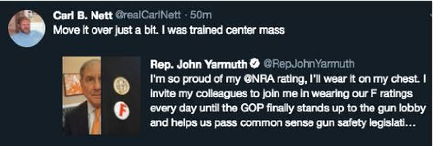 As first reported by the Courier-Journal, Carl Nett was responding to a tweet by Yarmuth that included a photo of the congressman wearing an “F” button on his lapel, indicating his pride for the grade he was given by the National Rifle Association.
