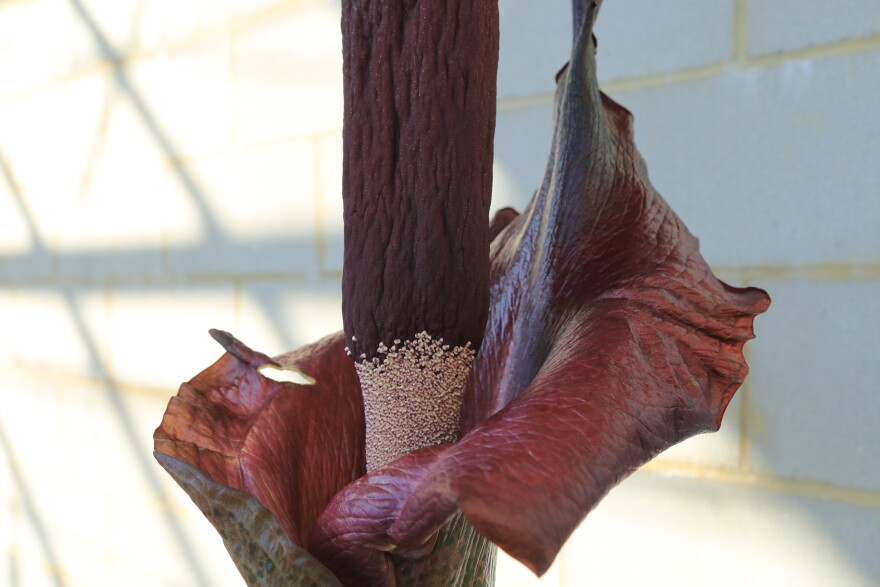 A beautiful but putrid-smelling flower has bloomed at the Yew Dell Botanical Gardens.