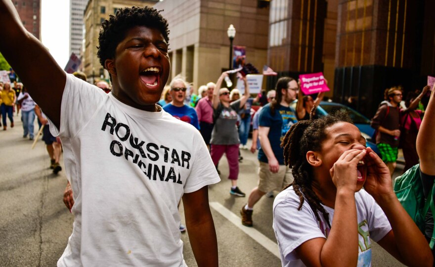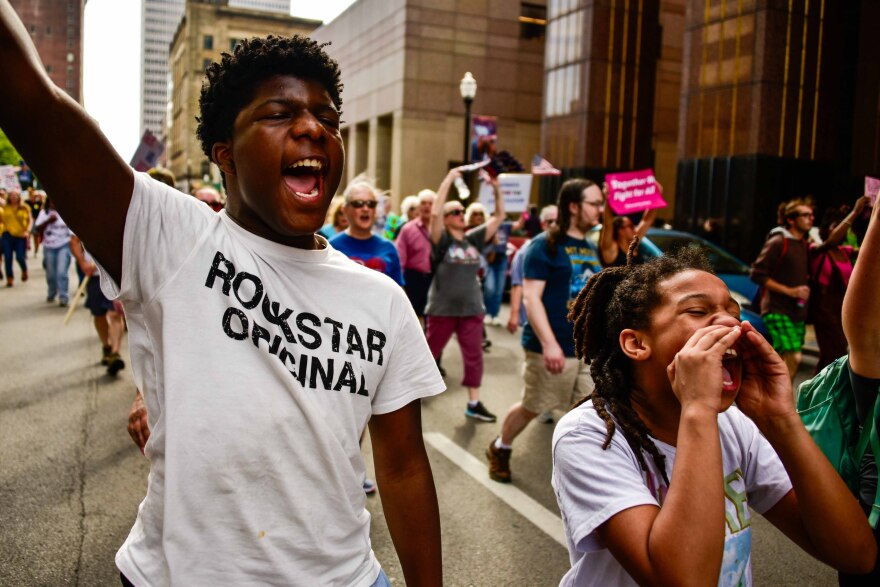 A river of chanting protesters, many carrying hand-crafted signs, flowed through the streets of downtown Louisville Saturday afternoon to show their opposition to U.S. President Donald Trump.