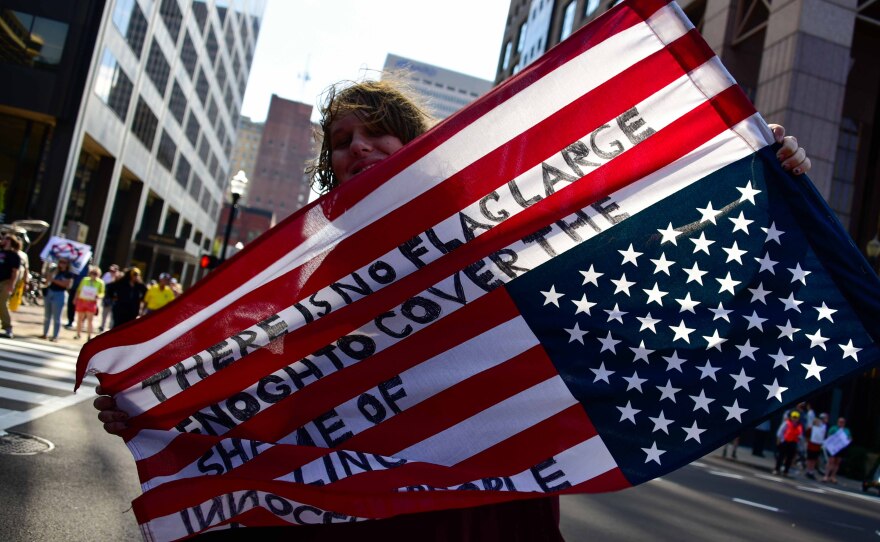 A protestor in Louisville's "No Kings" protest holds an upside American flag shaming the government for the "killing of innocent people."