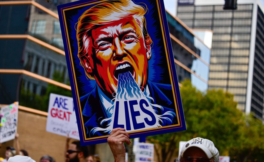 A sign from a protestor with an image of President Donald Trump and lies coming from his mouth.